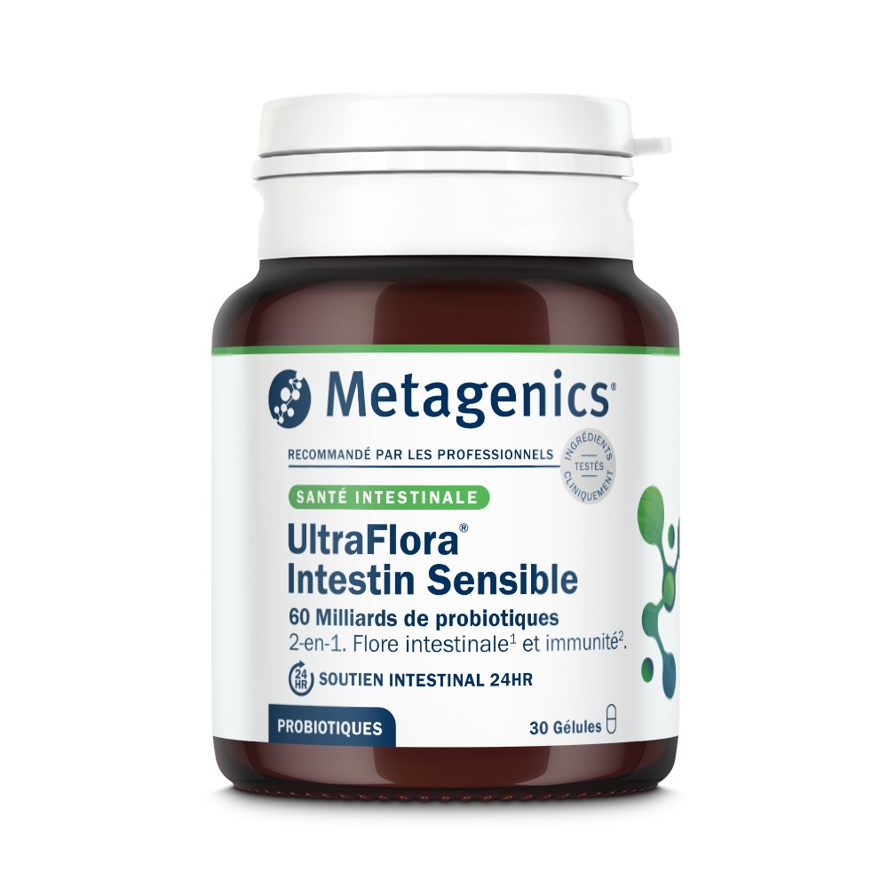 1UltraFlora® Intestin Sensible contient des probiotiques, qui aident à l’équilibre de la flore intestinale, 2et de la vitamine D qui soutient le fonctionnement normal du système immunitaire.